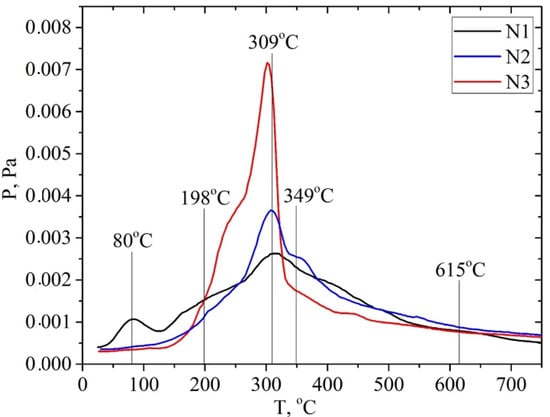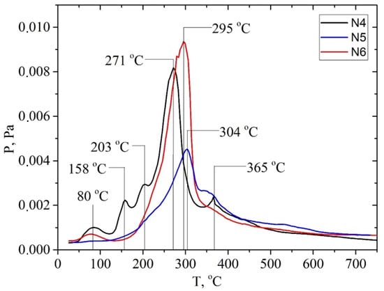The samples were analyzed using temperature-programmed desorption mass spectrometry (TPD-MS). An analysis of the P/T curves of the pressure of the volatile pyrolysis products against the temperature of the sample shows significant differences from the behavior of the P/T curves for the studied samples depending on both the type of biomass and the type of pretreatment, as shown in Figure 6.