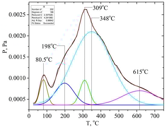 The P/T curve has overlapping peaks that correspond to the release of gaseous products due to thermal transformations of individual components of lignocellulose—hemicellulose, cellulose, and lignin. Decomposing the P/T curve into separate Gaussians makes it possible to identify the main stages of pyrolysis at 81, 198, 309, 348, and 615 °C, etc., (Figure 9).