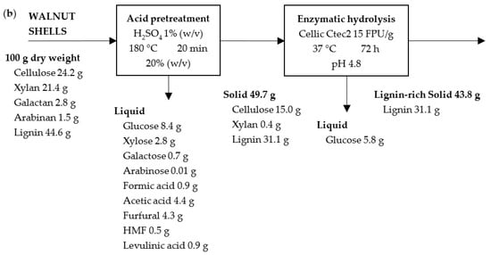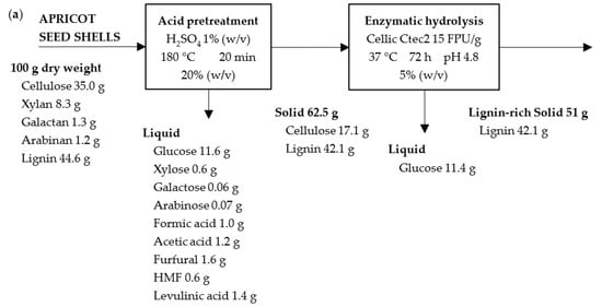 The maximum amount of lignin (82%) was achieved during the enzymatic hydrolysis of the solid after the acid pretreatment of the apricot seed shells due to the greater amount of lignin in the solid before the process (Figure 4a). In the case of walnut shells, the highest lignin values in the solids after enzymatic hydrolysis are around 70% for the cases of the acid and alkaline pretreated solids (Figure 4b). Samples subjected to 72 h of enzymatic hydrolysis were further analyzed.
