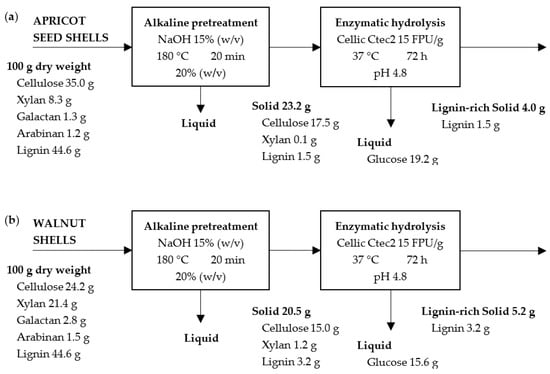 Mass balance for alkaline pretreatment and enzymatic hydrolysis of apricot seed shells (a) and walnut shells (b).