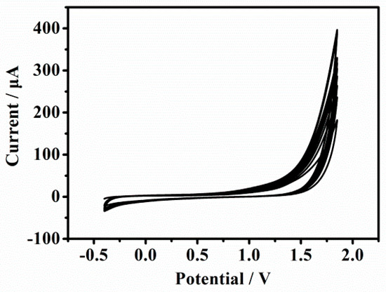 Cyclic voltammetry (CV) was performed in 0.1 M PBS (pH 7.0) to prepare p-Gly/rGO film on GCE. Herein, the potential range and the scanning rate are two important factors in preparing the polymer film. With the scanning rate of 100 mV·s−1, experimental results showed the formation of homogeneous and stable p-Gly/rGO film in −0.45~1.85 V. In Figure 1, the oxidation current gradually increased during repeated CVs, indicating that p-Gly has been successfully polymerized. The possible mechanism can be explained as follow: When the potential is applied, the surface of GCE is oxidized; At the same time, the amino group on glycine is activated into free radicals, which are connected to the electrode surface through C–N bond, and the activated amino group and the carboxyl group are condensed on the electrode surface and polymerized to form a p-Gly film [37,38].