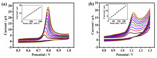 (a) CVs of p-Gly/rGO/GCE after adding 20 μM XT at the scanning rates of 20–200 mV·s−1 in 0.1 M PBS (pH 7.0). Inset: the correlated calibration plot. (b) CVs of p-Gly/rGO/GCE after adding 20 μM HX at the scanning rates of 20–200 mV·s−1 in 0.1 M PBS (pH 7.0). Inset: the correlated calibration diagram.