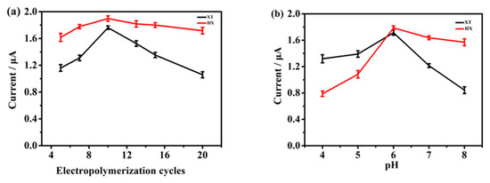 The pH of PBS can change peak current, which has a remarkable impact on the determination of XT and HX simultaneously. As displayed in Figure 5b, when the pH value varied from 4 to 8, the oxidation current increased and then decreased, reaching its maximum at pH 6.0. Thus, a pH of 6.0 was adjusted in the PBS for the subsequent experiments. Therefore, the optimal parameters of the sensor were pH 6.0 PBS and 10 cycles of polymerization.