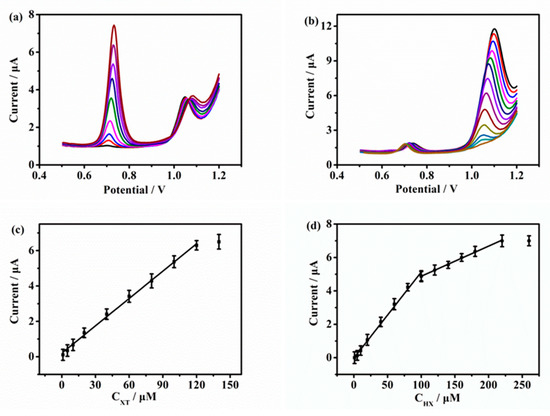 (a) DPVs of p-Gly/rGO/GCE with 20 μM HX for the determination of 1–120 μM XT in 0.1 M PBS (pH 6.0), (b) 1–220 μM HX with 20 μM XT in 0.1 M PBS (pH 6.0), (c,d) corresponding calibration plots, respectively.