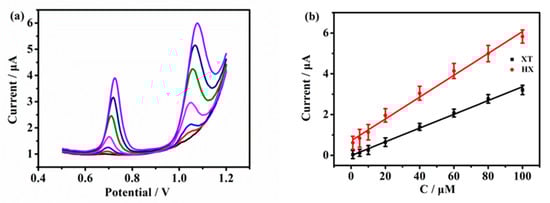 DPV was used to evaluate the sensitivity of p-Gly/rGO/GCE to XT and HX under optimal conditions. Firstly, the concentration of one substance in the solution was kept constant, while the concentration of the other substance in the solution was gradually changed to measure XT and HX separately. As shown in Figure 6a, the addition concentration of XT was continuously changed (1–120 μM), and every peak was separately measured when 20 μM HX in PBS was kept constant. The results displayed that the peak current value escalated with the addition of XT and was linearly related to XT concentration. The linear equation for the relationship of current value and XT concentrations is Ipa(μA) = 0.2046 + 0.0515CXT (μM) (R2 = 0.997). Similar to the above process, 20 μM XT was kept constant in 0.1 M PBS (pH 6.0), and HX was separately measured in the system. As shown in Figure 6b, when HX increased from 1 to 220 μM, the peak current value continuously increased. The linear equation is Ipa (μA) = −0.01775 + 0.0515CHX (μM) (R2 = 0.994) in the concentration of 1–100 μM, and Ipa (μA) = 3.073 + 0.018CHX (μM) (R2 = 0.994) in the concentration of 100–220 μM.