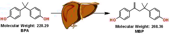 Image depicting metabolism of BPA to MBP in the liver based on the study of Yoshihara et al. [7]. A new unique potent BPA metabolite was observed having 40 mass units more than BPA and formed only in the presence of both cytosolic and microsomal fractions. The structure of this potent metabolite was established and named MBP, 4-methyl-2,4-bis (p hydroxyphenyl) pent-1-ene. Although BPA is a weak binder, its active MBP metabolite was several-thousand-fold more estrogenic than BPA.