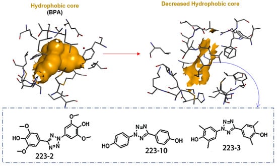Recent research highlighted that substituting the BPA’s isopropylidene hydrophobic core with the tetrazole core (upper figure) decreased the estrogenicity of bisphenol. For example, two of the designed NCEs with bisphenol structures (223-2 and 223-3) bearing a tetrazole core (lower figure with chemical structures within the dotted rectangle) were potentially non-estrogenic by in vitro studies (Figure S1 of the Supporting Information) and, therefore, a privileged BPA replacement [14].