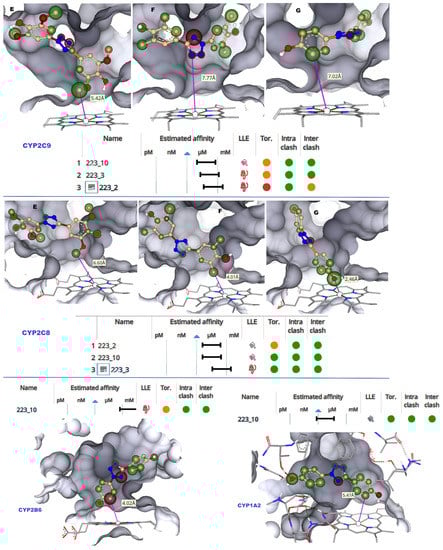 Images of CYP2C9, CYP2C8, CYP2B6, and CYP1A2 LBP docked with TbB ligands visualized with HYDE atomized coloring. White corona = neutrality, a green-colored corona = the ability of this atom to favorably contribute to BA, and a red-colored corona = the ability of this atom to non-favorably contribute to BA. (E) TbB ligand 223-2 atoms in LBP. (F) TbB ligand 223-3 atoms in LBP. (G) TbB ligand 223-10 atoms in LBP. The size of the corona sphere visually indicates the extent of favourable or non-favourable contribution to the BA. Larger spheres indicate more contribution and smaller spheres indicate less contribution to the BA. HYDE binding affinity (Ki) estimation of molecular docked poses of 223-2, 223-3, and 223-10 ligands in the active site of CYPs is represented as the range from mM < M < nM < pM. Green circle = favourable to BA. Red circle = non-favourable to BA. BA = binding affinity.