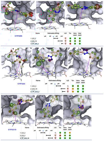 Images of CYP2D6, CYP3A4, and CYP2C19 LBP docked with TbB ligands visualized with HYDE atomized coloring. White corona = neutrality, a green-colored corona = the ability of this atom to favorably contribute to BA, and a red-colored corona = the ability of this atom to non-favorably contribute to BA. (E) TbB ligand 223-2 atoms in LBP. (F) TbB ligand 223-3 atoms in LBP. (G) TbB ligand 223-10 atoms in LBP. The size of the corona sphere visually indicates the extent of favourable or non-favourable contribution to the BA. Larger spheres indicate more contribution, and smaller spheres indicate less contribution to the BA. HYDE binding affinity (Ki) estimation of molecular docked poses of 223-2, 223-3, and 223-10 ligands in the active site of CYPs is represented as the range from mM < M < nM < pM. Green circle = favourable to BA. Red circle = non-favourable to BA. BA = binding affinity.