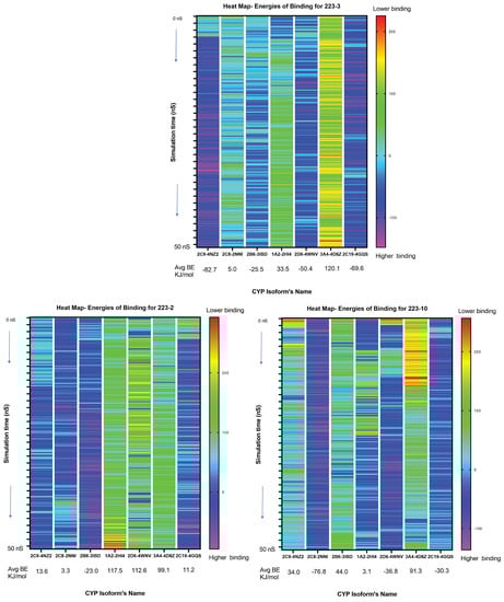 Binding energy of ligands is shown as a heat map calculated during the molecular dynamic (MD) simulation of 50 ns. The gradient of colored bands represents BE. The least binding is indicated by red bands, and the strongest binding by purple-colored bands. The greater the negative value of G, the better the stability of the ligand-CYP complex, and conversely, +G means an unstable ligand-CYP complex. Based on the MD simulation, the binding of the ligands can be hypothesized as 223-3 > 223-10 > 223-2. Therefore, 223-2 is the least prominent binder.