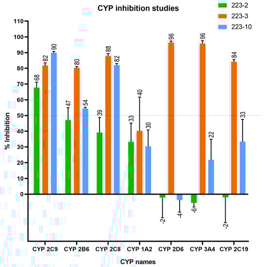 The regulatory bodies and pharmaceutical firms are quite concerned about CYP inhibition. Therefore, medicinal chemists often change the lead structure to decrease CYP inhibition. If left uncorrected, it can cause DDIs, enhanced drug concentration, and, thus, toxicity. Hence, to understand the CYP inhibition, the in vitro metabolism of TbB ligands by human CYP involving most common isoforms such as CYP2C8 (Amodiaquine), CYP2D6 (Dextromethorphan), CYP2C9 (Tolbutamide), CYP2B6 (Bupropion), CYP3A4 (Midazolam), CYP1A2 (Phenacetin) and CYP2C19 (S-Mephenytoin) using their respective probe substrates at single concentration of 10 M was investigated as shown in Figure 6.