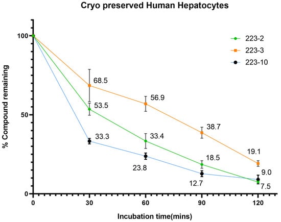 Microsomal stability was determined for the TbB ligands by monitoring the presence of compound after incubation in CPHH and HLM, as shown in Figure 7 and Figure S18 of the Supporting Information. Figure S18 of the Supporting Information shows that the phase 1 enzymes of HLM metabolizes the TbB ligand 223-3, whereas the other TbB ligands demonstrated stability in the HLM. Such an observation with NCEs is common because, with HLM, NADPH is used as a cofactor, thereby focusing mainly on phase 1 oxidation pathways such as P450 metabolism. Although additional enzymes, such as UDP-glucuronosyltransferase (UGTs), are present in HLM, the lack of the associated necessary cofactors prevents them from being functionally active (e.g., uridine diphosphate glucuronic acid (UDPGA)). In contrast, all the three TbB ligands metabolized in cryopreserved hepatocytes (Figure 7). Only <20% of the parent compound remained, suggesting that these ligands predominantly undergo phase II metabolism or non-CYP pathways. The reason could be that hepatocytes have all the necessary enzymes and cofactors for the metabolic processes. Since they contain the complete set of oxidative/reductive, hydrolytic, and conjugative drug metabolizing enzymes found in the liver, they are regarded as the gold standard. Therefore, they are preferred in vitro options for expressing metabolic stability as substrate depletion, total metabolic clearance, and T [29].