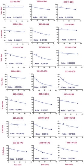 This method yielded good correlations between the percent inhibition at 10 or 25 M and kinact/KI. Evaluation of TD inhibition at single concentration has been implemented in several drug discovery programs [32,33,34]. Evaluation of the single K approach revealed that, using a database of 400 reference compounds a K value of 0.02 min (or 45% inhibition after 30 min) is a good indicator of TD inhibition potential [32]. Therefore, in this study, a single K approach has been utilized to understand the TD inhibition potential of TbB ligands. The results are shown in Table 4. Ideally, the inhibition of CYPs can be reversible or irreversible. The data obtained from single-concentration K studies were analyzed to understand the same. From the data presented in Table 4, the TbB ligands have values less than 50% for reversible inhibition (R_Inh). As the qualified % reversible inhibition is considered significant if >50%, no significant reversible inhibition is observed for TbB ligands. Knowledge about enzyme inactivation half-life (E½) is also equally important as it would provide insight into the TD inhibition of a compound. E½ can be used to bin the compounds as positive or negative TD inhibitors if the values are <28 or >28, respectively. The TbB ligand 223-2 is observed to be a weak positive TD inhibitor of 1A2 and is negative TD inhibitor to the other six CYP isoforms. On the other hand, the TbB ligand 223-3 is observed to be positive inhibitor of 1A2, 2C9, 2C8, and C19, whereas it is a negative TD inhibitor to the other three CYP isoforms.