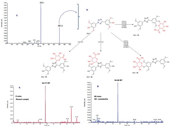 MetID studies of 223-2 incubated in hepatocytes until 80 min. (A) Representative chromatogram at 0 min of incubated TbB ligand 223-2 at room temperature. The peak of the parent compound (223-2) is observed at RT of 23.77 min. (B) Representative chromatogram of incubated TbB ligand 223-2 at room temperature highlighting the formation of M1 metabolite at RT of 18.49 min due to metabolism of 223-2 ligand at 80 min. (C) Enhanced product ion (EPI) spectrum with the full range of M1 metabolite. Based on the fragmentation pattern, the parent ion m/z for this metabolite was found to be 551 (375 + 176). This m/z indicates the formation of glucuronide. (D) A schematic representation of the proposed O- and N-glucuronidation of 223-2 ligand, as the exact position of glucuronide binding to compound 223-2 could not be deduced from the fragmentation pattern.
