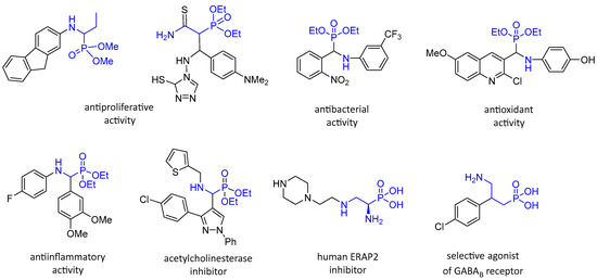 Compounds containing an aminophosphonic unit display a wide spectrum of biological activity (Figure 4), e.g., antiproliferative [28,29,30,31], antimicrobial [32,33,34], antiviral [35,36], antioxidant [37,38,39,40], anti-inflammatory [37,41,42] and they act as inhibitors of various enzymes such as acetylcholinesterase [43,44,45], aminopeptidases [46,47] or α-glucosidase [48].