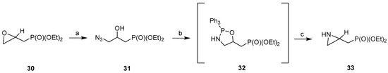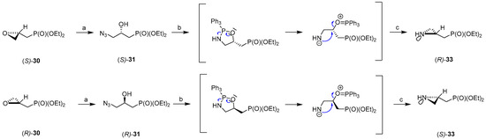 The epoxides (S)-30 and (R)-30 were transformed into corresponding enantiomerically enriched diethyl (S)- and (R)-3-azido-2-hydroxypropylphosphonates (S)-31 (ee 96%) and (R)-31 (ee 96%) respectively, which were then subjected to the two-step reaction sequence leading to the formation of enantiomerically enriched diethyl (R)- and (S)-(aziridin-2-yl)methylphosphonates (R)-33 and (S)-33 (Scheme 8). As reported in the literature, during the transformation of unstable intermediate oxazaphospholidine into aziridinephosphonate 33 inversion of configuration at C2 occurs, thereby aziridinephosponate (S)-33 was obtained from epoxide (R)-30, while (R)-33 was produced from epoxide (S)-30 [54,60].