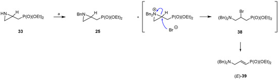 Our previous studies proved that non-activated aziridinephosphonates, namely benzylamino-[1-(1-phenylethyl)aziridin-2-yl]methylphosphonates [52] and hydroxy-[1-(1-phenylethyl)aziridin-2-yl]methylphosphonates [50,55], react regiospecifically with nucleophiles on less-hindered C3 atom to form aziridine ring-opening products. Following these observations, analogous N-benzylated azidirinephosphonate (RS)-25 was selected as a substrate for the synthesis of designed compounds (RS)-26, (RS)-27, and (RS)-28. When (aziridin-2-yl)methylphosphonate (RS)-33 was treated with benzyl bromide in the presence of potassium carbonate at room temperature for 24 h, aziridinephosphonate (RS)-25 (δ31P = 28.55 ppm; 85%) was formed together with 3-(N,N-dibenzylamino)-2-bromopropylphosphonate as a by-product 38 (δ31P = 27.00 ppm; 15%) (Scheme 5). After chromatographic purification of crude reaction mixture N-benzyl-(aziridin-2-yl)methylphosphonate (RS)-25 in 62% yield was obtained. However, instead of compound 38 (δ31P = 27.00 ppm), (E)-3-(N,N-dibenzylamino)prop-1-enylphosphonate (E)-39 was isolated (δ31P = 18.25 ppm). Since crude aziridinephosphonate (RS)-33 was used for the preparation of (RS)-25, it can be concluded that subsequent benzylation occurred leading to the formation of unstable aziridine ion, which upon reaction with bromine anion and further elimination of HBr on silica gel gave phosphonate (E)-39 (Scheme 5). These observations are in good agreement with the reactivity of aziridinium ion derived from respectively functionalized phosphonates [56,57] and 2-(bromomethyl)aziridines [58].