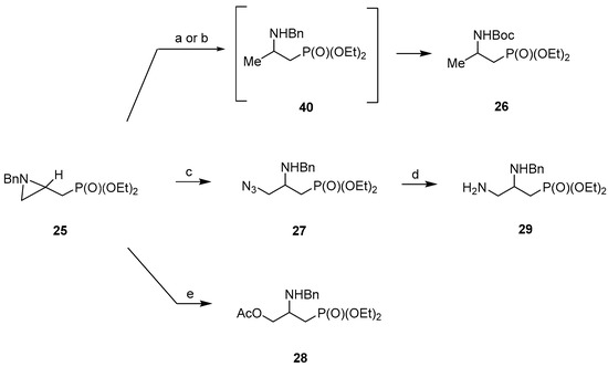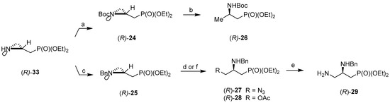 As a continuation of our studies on the synthesis of phosphonates functionalized with amino and hydroxy groups [49,50,51,52], a new series of enantiomerically enriched (R)- and (S)-diethyl 2-amino-, 2,3-diamino- and 2-amino-3-hydroxypropylphosphonates has been designed. Our synthetic strategy includes as a key step aziridine ring-opening reaction in both activated (24; R = Boc) and non-activated (25; R = Bn) (aziridin-2-yl)methylphosphonates, with selected nucleophiles (Scheme 2).