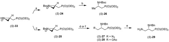 Aziridinephosphonates (R)-33 and (S)-33 were then transformed into their N-protected derivatives (R)-24 and (S)-24 (N-Boc) or (R)-25 and (S)-25 (N-Bn), to make them suitable for further regiospecific ring-opening reactions with respective nucleophiles (Scheme 9 and Scheme 10).