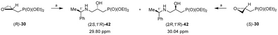 From (R)-2,3-epoxypropylphosponate (R)-30 (0.031 g, 0.16 mmol) and (R)-1-phenylethylamine (0.022 mL, 0.18 mmol) a 96:4 mixture of (2R,1R′)-31 (δ31P = 30.04 ppm) and (2S,1R′)-42 (δ31P = 29.80 ppm) was produced, and the enantiomeric purity of the starting epoxide (R)-30 was determined (ee = 92%).