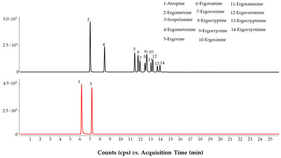 Separation of ergot (10 µg/kg) and tropane (5 µg/kg) alkaloids in spiked wheat samples using the optimized method.