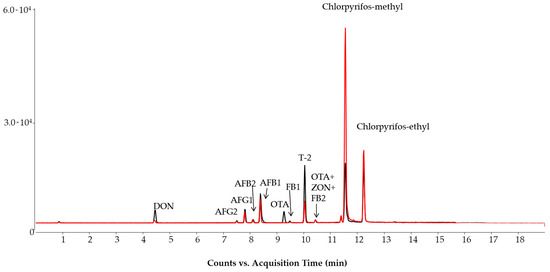 Total ion chromatograms of mycotoxins and chlorpyrifos-ethyl/methyl in standard solution recorded under acidic (pH 3, red line) and alkaline (pH 8.3, black line) mobile phase conditions. Concentrations: chlorpyrifos-ethyl/methyl, DON, FB1, FB2, 10 ng/mL; AFB1, AFG1, OTA, 1 ng/mL; AFB2, AFG2, 0.25 ng/mL; HT-2, T-2, ZON, 5 ng/mL. The chromatograms were recorded in an earlier stage of the method development.
