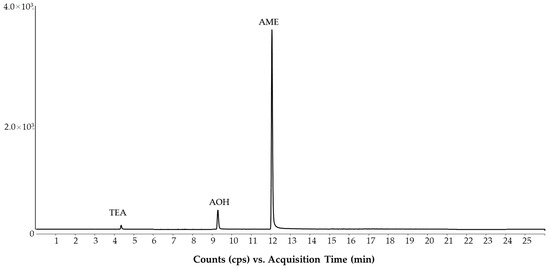 The other aspect of the method was the sample preparation. The QuEChERS approach described for maize and wheat samples in the standard pesticide method was tested since the QuEChERS is also used for ergot alkaloids in the EN 17425:2021 standard method [19]. Moreover, Bessaire et al. published a collaborative trial using the QuEChERS-LC-MS/MS method for analyzing mycotoxins [23] and Mujahid et al. proposed QuEChERS for Alternaria toxins [22]. The modification to the standard pesticide method involved the extraction time, which was adjusted to 30 min. Even though QuEChERS has been tested for analysis of Alternaria toxins [22], the acetonitrile-based extraction was not recommended for the extraction of Alternaria toxins earlier because methanol is preferable [40]. We also found that the absolute recovery of polar TEA, using QuEChERS extraction, was lower than 50%. The other two Alternaria toxins, AME and AOH, had higher recoveries (>80%) due to their lipophilic structures. Hence, the Alternaria ISTD solution (AME-d3, AOH-d2, TEA-13C2) was added to the sample before extraction to enhance the recovery. This was also recommended in previous papers [22,40]. The isotope dilution considerably improved the recovery of TEA, but the 50% loss increased its limit of quantification (LOQ). Furthermore, the injection solution consisted of acetonitrile, which caused peak distortion of TEA when the injection volume was higher than 2.0 µL. The separation of Alternaria toxins at pH 8.3 in a cereal matrix gave fit-for-purpose LC-MS/MS analysis (Figure 4), but the high (>50%) ion suppression of AME, described also in earlier methods [34,35,36,40], was also seen. Therefore, isotope dilution was needed for appropriate quantification.