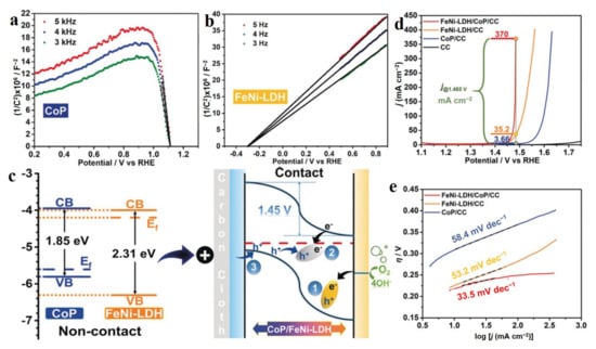 Metal phosphides (MPx) have been widely applied in electrocatalysis due to their multifunctional active sites, tunable structures, and compositions, as well as plentiful electronic properties [76]. Liu et al. reported a FeNi-LDH-CoP n-p junction structure composed of amorphous n-type FeNi-LDH and p-type CoP nanoarrays, which exhibited excellent OER performance with 231 mV overpotential at 20 mA cm−2 [77]. From Mott–Schottky (M-S) plots of FeNi-LDH and CoP, it was easily observed that FeNi-LDH was a n-type semiconductor with a positive slope of Tauc plot and CoP was a p-type semiconductor with a negative slope of Tauc plot (Figure 9a,b) The flat band (FB) potentials for FeNi-LDH and CoP were −0.3 and 1.11 V vs. RHE, respectively. Therefore, the band structures of FeNi-LDH and CoP could be obtained, as shown in Figure 9c (left), when they were not contact. Due to the different Fermi levels of two semiconductors, electrons over CoP transferred to FeNi-LDH when they were in contact (Figure 9c (right)). The electron transfer process could be easily observed in XPS data of serial catalysts, which led to enhanced OER activity of CoP-FeNi-LDH with a low Tafel slope of 33.5 mV dec−1 (Figure 9d,e). The excellent OER performance of the CoP-FeNi-LDH junction was attributed to the positively charged FeNi-LDH site possessing a strong ability for adsorbing OH, thus greatly facilitating the OER dynamics with a low energy barrier. This work provides an efficient approach to develop advanced electrocatalysts through constructing an n-p and p-p junction with a strong ability for OH adsorption [78,79]. In short, metal phosphides hybridized with LDH usually possess excellent electrocatalytic performance in water splitting with several hundred current densities up to 300 mA cm−2, especially for their superior OER activities [78,80,81].