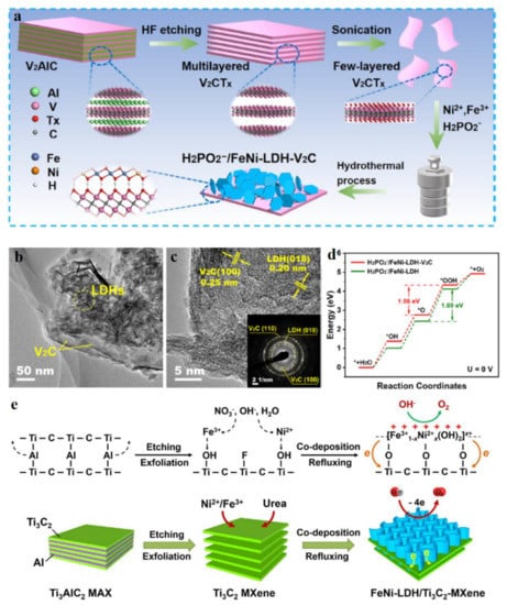 Figure 10. Schematic illustration, characterizations, and electrocatalytic performance of MXene hybridized with LDH. (a) Preparation process of H2PO2/NiFe-LDH-V2C. (b,c) TEM images of H2PO2/NiFe-LDH-V2C. (d) Calculated energy profile of OER over H2PO2/NiFe-LDH-V2C and H2PO2/NiFe-LDH at U = 0 V. (e) Preparation process of NiFe-LDH-Ti3C2. (ad) Reproduced with permission [84]. Copyright 2021, Elsevier. (e) Reproduced with permission [85]. Copyright 2018, Elsevier.