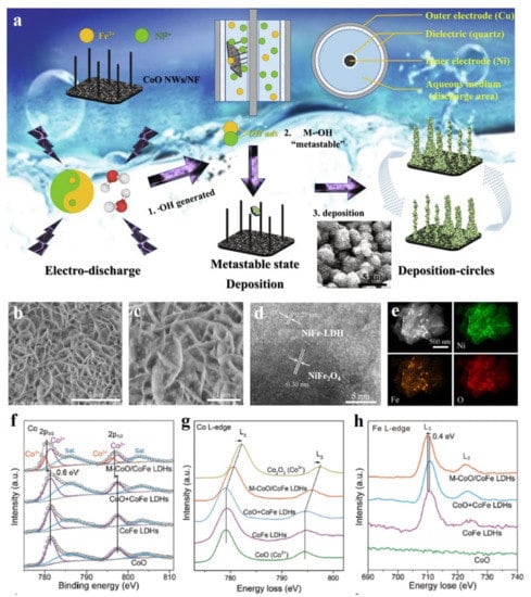 Figure 11. Schematic illustration and characterizations of metal oxides hybridized with LDH. (a) Schematic illustration of preparing CoO-NiFe-LDH. (b,c) SEM images of NiFe2O4/NiFe-LDH. (d) High resolution TEM image of NiFe2O4/NiFe-LDH. (e) Dark field TEM and elemental mapping images of NiFe2O4/NiFe-LDH. (f) Co 2p XPS spectra of serial Co-based materials. (g) Co EELS spectra of serial Co-based materials. (h) Fe EELS spectra of serial Co-based materials. (a) Reproduced with permission [90]. Copyright 2021, Elsevier. (be) Reproduced with permission [91]. Copyright 2018, American Chemical Society. (fh) Reproduced with permission [92]. Copyright 2018, Wiley-VCH.
