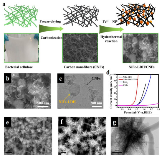 Figure 12. Schematic illustration, characterizations, and electrocatalytic performance of carbon materials hybridized with LDH. (a) Schematic illustration of preparing FeNi-LDH/carbon nanofibers. (b,c) SEM (b) and TEM (c) images of FeNi-LDH/carbon nanofibers. (d) LSV curves of serial catalysts. (eg) SEM (e,f) and TEM (g) images of NiFe-LDH/carbon fibers. (ad) Reproduced with permission [104]. Copyright 2022, Elsevier. (eg) Reproduced with permission [106]. Copyright 2022, American Chemical Society.