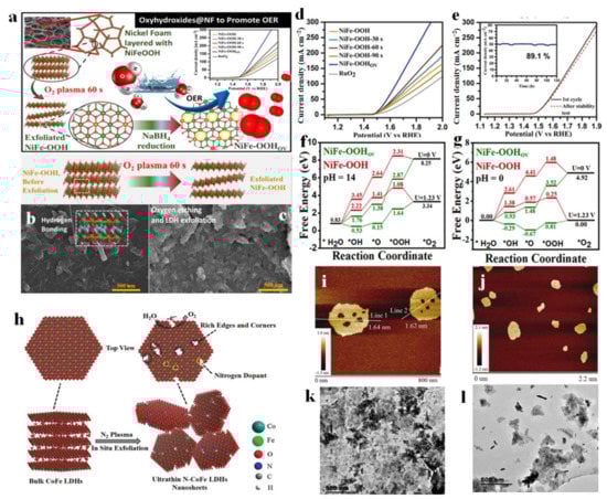 Figure 15. Preparation illustration, characterizations, and theoretical studies of LDH exfoliation. (a) Schematic illustration of structural tuning in NiFe-OOH grown on Ni Foam as the substrate to fabricate NiFe-OOHOV catalyst for OER. (b,c) SEM images of (b) NiFe-OOH and (c) NiFe-OOH after 60 s of O-plasma exposure (NiFe-OOH 60 s). (d) OER polarization curves of NiFe-OOHOV, NiFe-OOH-30 s, NiFe-OOH-60 s, NiFe-OOH-90 s, and NiFe-OOH catalysts compared to RuO2 in 1.0 M KOH electrolyte. (e) OER polarization curves for NiFe-OOHOV before and after long-term stability test. The inset shows the chronoamperometric response at a current density of 50 mA cm−2 for 120 h. (f,g) Free energy diagrams of NiFe-OOH and NiFe-OOHOV for the OER at different pH: (f) pH = 0 and (g) pH = 14. (h) Illustration of the exfoliation of bulk CoFe-LDHs into ultrathin CoFe-LDHs nanosheets by N2 plasma. (i,j) AFM images of the ultrathin N-CoFe LDHs nanosheets. (k,l) TEM of (k) NiFe LDH and (l) Exf NiFe-LDH with 15 min. (ag) Reproduced with permission [125]. Copyright 2021, American Chemical Society. (hj) Reproduced with permission [126]. Copyright 2018, Wiley-VCH. (k,l) Reproduced with permission [127]. Copyright 2021, Elsevier.