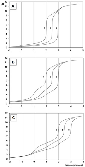 In principle, Ida2− has three, IdaP3− has four, while Ida2P4− has five donor atoms to be protonated. Starting with the titrations from the acidic range, the appropriate curves (see Figure 1) reveal that, for H3Ida+, the deprotonation of the two carboxylic functions is complete at pH 4, while the secondary ammonium group loses its proton at around pH 9. For the phosphonic acids in the measurable pH range, only one –OH of the phosphonic group is protonated, while the other is already in its deprotonated form, due to the high acidity of that –OH group [9]. This is reflected in the titration curves. In addition to the deprotonation of the secondary ammonium group at around pH 10, at a lower pH, there is one for H3IdaP, while there are two equivalents base consumption for H4Ida2P, which indicates the deprotonation of the phosphonic functions of the ligands. The obtained logKi in Table 1 agrees well with the previously determined values, which were calculated under identical or very similar conditions [9]. The higher basicity of the imino group in IdaP3−, and especially in Ida2P4−, can be interpreted by the increased electron density on it due to the presence of an increasing number of doubly negatively charged phosphonate groups instead of the carboxylate(s).