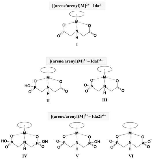 A large number of complexes incorporating organometallic platinum group metal ions (e.g., [(η6-arene)M]2+ (MII = Ru, Os) or [(η5-Cp*)M]2+ (MIII = Rh, Ir; Cp* = pentamethylcyclopentadienyl anion)) that exhibit promising anticancer potential with fewer side-effects compared to cisplatin have been synthesized and characterized in the solid state during the past decades [15,16,17,18,19,20,21,22,23]. In order to explore the fate of these compounds, and to obtain reliable speciation in an aqueous medium, solution equilibrium studies may provide us with help exploring the stoichiometry, the stability, and likely the binding mode of the species that are present in a solution. In this context, in the last decade, the complexation processes of several systems containing either [(η6-p-cym)Ru(H2O)3]2+ (p-cym = 1-methyl-4-isopropylbenzene) or [(η5-Cp*)Rh(H2O)3]2+ cations were explored [24,25,26,27,28,29,30]. With this type of metal ion, however, only a single publication can be found relating to any direct interaction with phosphonates. It was very recently demonstrated that glyphosate and glyphosine (N-bis(phosphonomethyl)glycine) coordinates to [(η5-Cp*)Ir(H2O)3]2+ in a tridentate manner to form stable (O,N,O) chelates. The retained piano-stool geometry of the complexes was supported by XRD. The hybrid materials that were derived from supporting the above complexes onto rutile TiO2 were found to be effective molecular catalysts in water oxidation [31]. In another study, aminophosphonate complexes of [(η6-p-cym)Ru]2+ were used as catalysts to reduce ketones, however, in this case, the phosphonate units were not in the coordination sphere of metal ion [32].