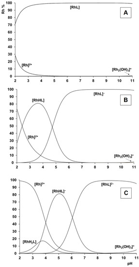 Concentration distribution curves calculated for the [(η5-Cp*)Rh]2+–Ida2− (A), –IdaP3− (B), and Ida2P4− (C) systems at a 1:1 ratio (cRu = 3 mM, I = 0.20 M KCl). “Rh” stands for the [(η5-Cp*)Rh]2+ entity.