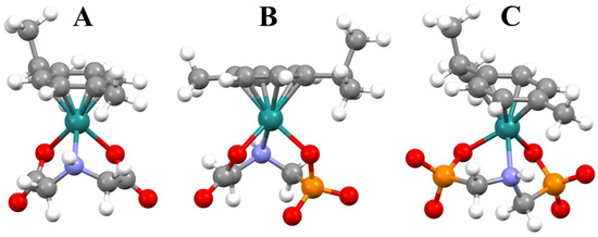 The DFT optimized structure of the [(η6-p-cym)Ru(Ida)] (A), [(η6-p-cym)Ru(IdaP)]− (B), and [(η6-p-cym)Ru(Ida2P)]2− (C).