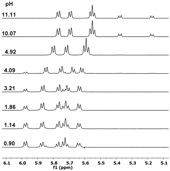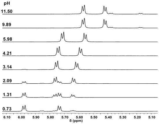 For the [(η6-p-cym)Ru]2+–Ida2P4− system (Figure 6), which also contains a symmetrical ligand (as above with Ida2−), the pH-dependence of the NMR spectra reveal that the free [(η6-p-cym)Ru]2+ (5.73 and 5.98 ppm) above pH ~ 3.5 is not detectable in a measurable concentration anymore, while a new set of signals belonging to the complexed species are observable as low as pH 1.3. Upon increasing the pH, the continuous upfield shift of them is in line with the stepwise deprotonation processes of [MH2L] and [MHL], resulting in the formation [ML] as the final complex. The hydrolysis of the metal ion that was indicated at 5.18 and 5.38 ppm (similarly to the data for the Ida2− system, Figure 5) does not exceed 5%, even at pH 11.5.