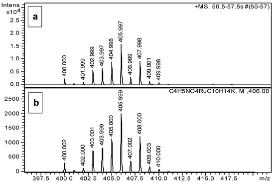Measured (a) and calculated (b) isotope pattern of [(η6-p-cym)Ru(Ida)]+K+ ion.