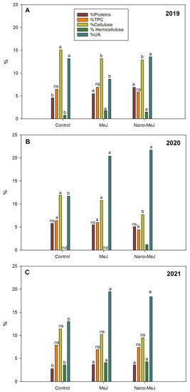 Figure 1 shows the profile of the skin cell wall with respect to season (2019, 2020, and 2021) and treatments (control, MeJ and nano-MeJ). The different components analysed were proteins, total phenolic compounds, uronic acids, cellulosic glucose and non-cellulosic glucose.