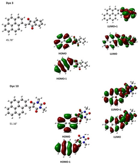 As anticipated, the minor variations of the substitution pattern of Dye 12 and Dye 13 did not modify the UV–visible absorption spectra, as experimentally observed. Examination of the contour plots of the Highest Occupied Molecular Orbital (HOMO) and the Lowest Unoccupied Molecular Orbital (LUMO) revealed a classical electronic distribution for the two orbitals. As shown in Figure 5, logically, the HOMO orbital is located on the electron donor, whereas the LUMO level is centered on the electron-accepting one.