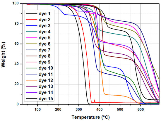 For numerous applications, the thermal stability of dyes is an important parameter, notably for applications such as solar cells [139,140,141,142]. The thermal properties of the different dyes were examined by thermal gravimetry analyses, and a summary of the decomposition temperatures is given in Table 4 and in Figure 11. Noticeably, despite the presence of the same electron-donating group, major differences could be determined concerning the decomposition temperatures of Dye 1–Dye 15. The lowest one was determined for Dye 3, at 176 °C. Conversely, the highest one was found for Dye 15, determined at 400 °C. Only three dyes showed decomposition temperatures lower than 300 °C, evidencing their remarkable thermal stability.