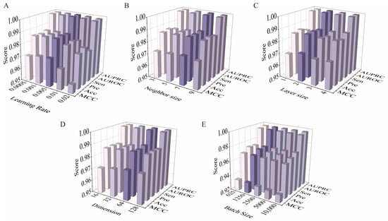 Optimization results of model parameters. (A) Effect of the parameter learning rate of the NFMs on model performance. (B) Effect of the neighbor size of the KGCN on model performance. (C) Effect of the number of layers of the KGCN on model performance. (D) Effect of the embedding dimension of the KGCN on model performance. (E) Effect of the batch size of the DNN on model performance.