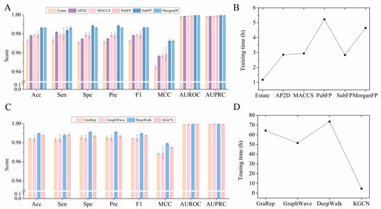In this section, various embedding and fingerprint descriptors were compared to obtain the optimized performance. As illustrated in Figure 3A, the EstateFP descriptor achieved the lowest average Acc, Sen, Spe, Pre, F1, MCC, AUROC, and AUPRC, which may be caused by the fact that the descriptor is only a 79-dimensional feature vector and cannot sufficiently capture the drug structure information. For AP2D, MACCS, PubFP, and SubFP, the results of Acc from the 10-fold CV were about 97.84%, 97.86%, 97.98%, and 98.64%, about 0.91%, 0.89%, 0.77%, and 0.11% lower than those of MorganFP, respectively. Although the training time of SubFP is shorter than that of MorganFP (Figure 3B), the RSD of the former is larger than that of the latter, indicating that the prediction model constructed by MorganFP is more robust. Therefore, the MorganFP descriptor is the feasible feature for characterizing drug structure in the current study.