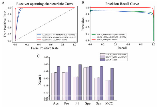 The impact of each component in the KGCN_NFM framework on the prediction performance. (A,B) represent the ROC and PR curves of the model with or without the removal of certain components, respectively. (C) represents the effect of different components on model performance.
