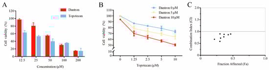 Potentiation of the cytotoxic action of topotecan in combination with dantron in A549 cells. (A) The cytotoxic effects of topotecan and dantron, respectively. (B) Curves of dose–response for combination treatment with topotecan and dantron. (C) Combination index (CI) vs. fraction affected (Fa) plot for the dose–response graphs. CI < 1, synergism.
