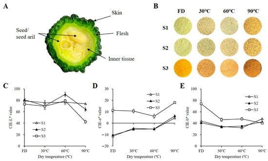 The fruits were washed with distilled water and dried using a paper towel. The fruit samples were cross sectioned at a thickness of 1 cm. The skin, flesh, and inner tissues were obtained and the seeds were removed (Figure 1A). The separated fruits were immediately dried after each harvest without storage. Batches of the samples were freeze-dried in a freeze dryer as a control group. For thermal processing, the samples were hot-air dried using a dry machine (Koencon Co., Ltd., Hanam, Republic of Korea) until the water content was <10% at 30, 60, and 90 °C for 3 days, respectively. The dried samples were pulverized using a commercial mixer and sieved with a 100-mesh size.