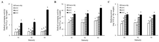 Radical scavenging activity of (A) DPPH and (B) ABTS and (C) reducing power evaluated using FRAP assay according to drying temperature of different maturities of M. charantia fruit. Different letters within each maturity stage indicate significant differences according to Tukey’s studentized test at p < 0.05.