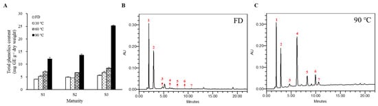Changes of total phenolic content (A) in thermal processing of M. charantia. (B) Chromatograms of phenolic compounds in (B) freeze-dried (FD) and (C) 90 °C heat-treated S3 detected at 280 nm using HPLC analysis.