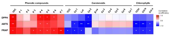 Correlation coefficients between antioxidant activities and phytochemicals in heat-processed M. charantia. TPC: total phenolic content; P1–P7: candidate phenolic compound 1–7; TCC: total carotenoid content; Ca1–Ca7: carotenoid ester 1–7; Lut: lutein; β-ca: β-carotene; TChl: total chlorophylls; Chl b: chlorophyll b; and Chl a: chlorophyll a. Asterisks indicate significance (* p < 0.05; ** p < 0.01) using Pearson’s correlation analysis.