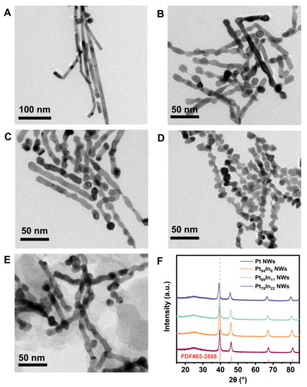 TEM images of (A) Pt NWs, (B) Pt94In6 NWs, (C) Pt89In11 NWs, (D) Pt78In22 NWs. (E) TEM image of carbon-supported Pt89In11 NWs. (F) XRD patterns of Pt and Pt-In NWs.